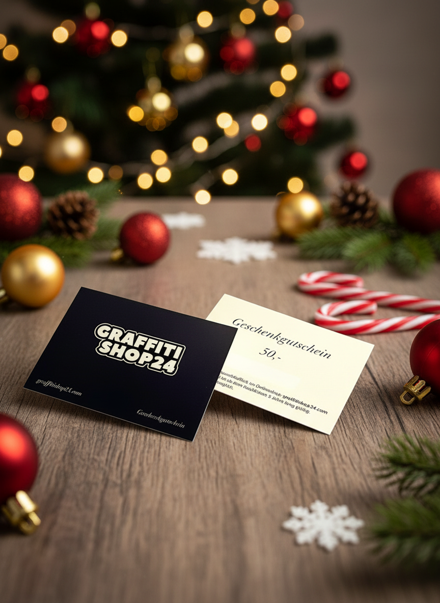 Noch keine Geschenkidee? Mit unseren Geschenkgutscheinen liegst du immer richtig! Ob für Sprühdosen, Marker oder Zubehör – der Gutschein lässt sich flexibel im gesamten Shop einlösen und passt perfekt unter jeden Weihnachtsbaum. Schnell bestellt, sofort verfügbar und ideal für alle, die kreative Überraschungen lieben.